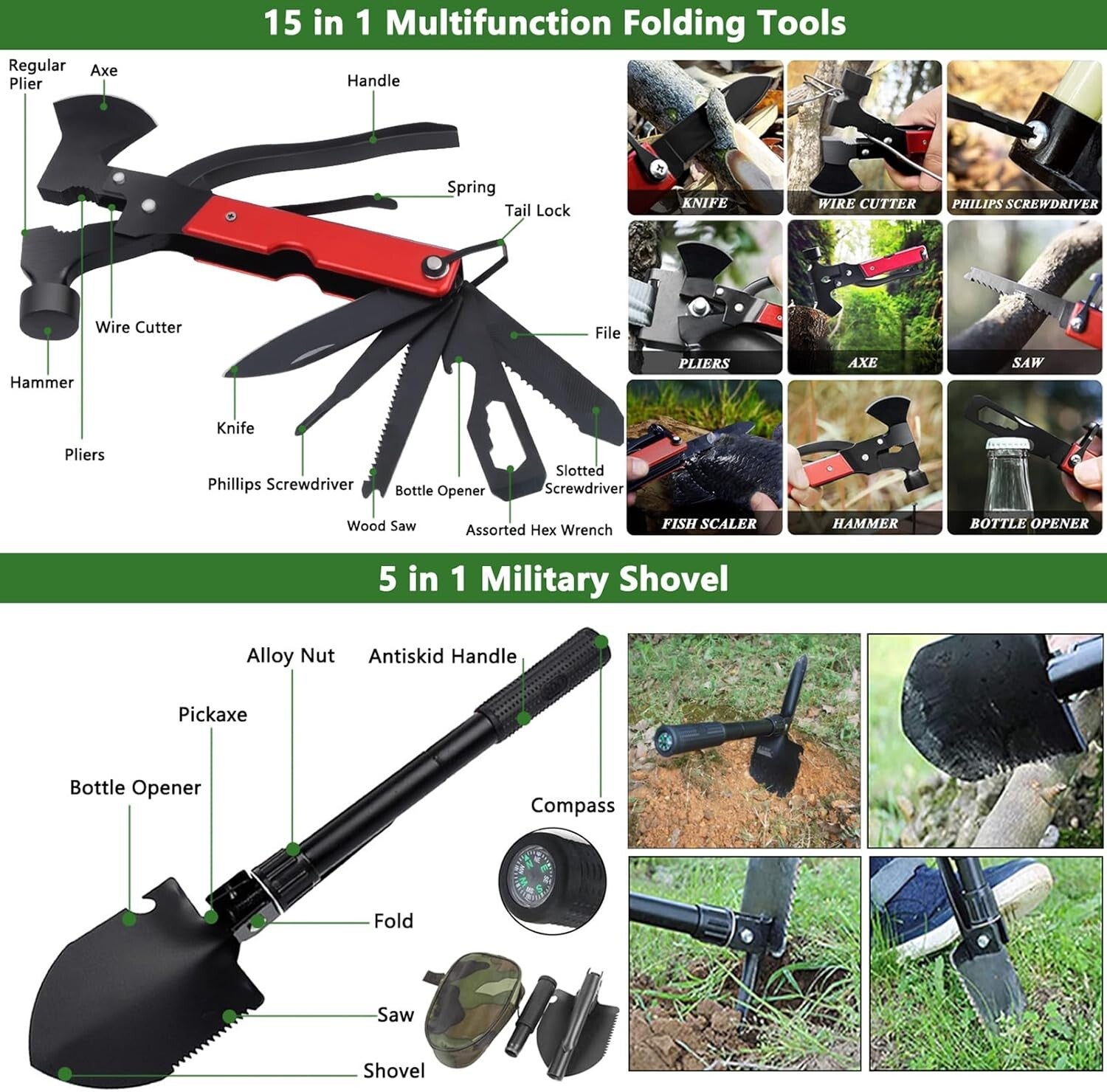 AuRiver Kit de Supervivencia, Equipo de Emergencia, Kit Supervivencia con Hacha de Martillo Multifuncional, Kit de Emergencia para Viajar Caminar Acampar al Aire Montaña (Negro)